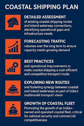 Objectives include assessing current coastal routes and inland waterways, forecasting traffic, improving operational efficiency, identifying new routes, promoting Indian-owned vessels, and fostering integration with inland waterways to advance multimodal transport.