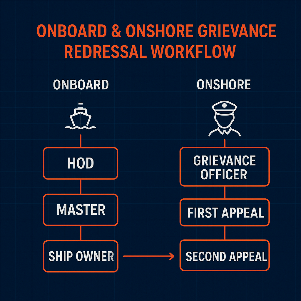 - Escalation Path: If the Head of Department cannot resolve the issue within 3 days, it must be referred to the Master of the ship, who has 7 days to handle it. If the Master cannot resolve it, they must refer it to the ship owner, who has a maximum of 1 month to find a solution. Throughout this process, the seafarer has the right to be accompanied and represented by another seafarer of their choice.