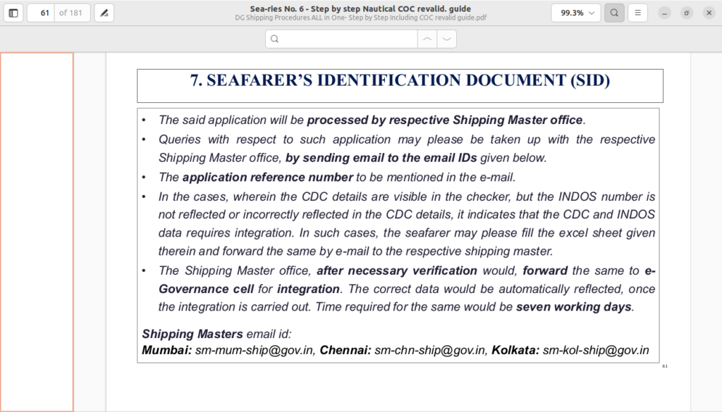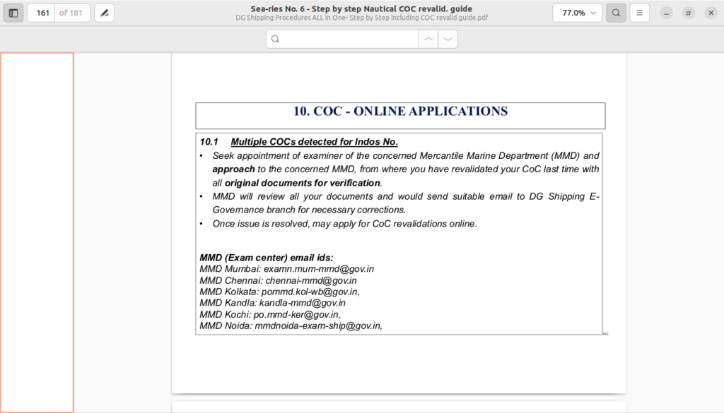 - In cases of eligibility queries or missing sea service records, liaise with respective MMD examiners with all original documents and prescribed fees.