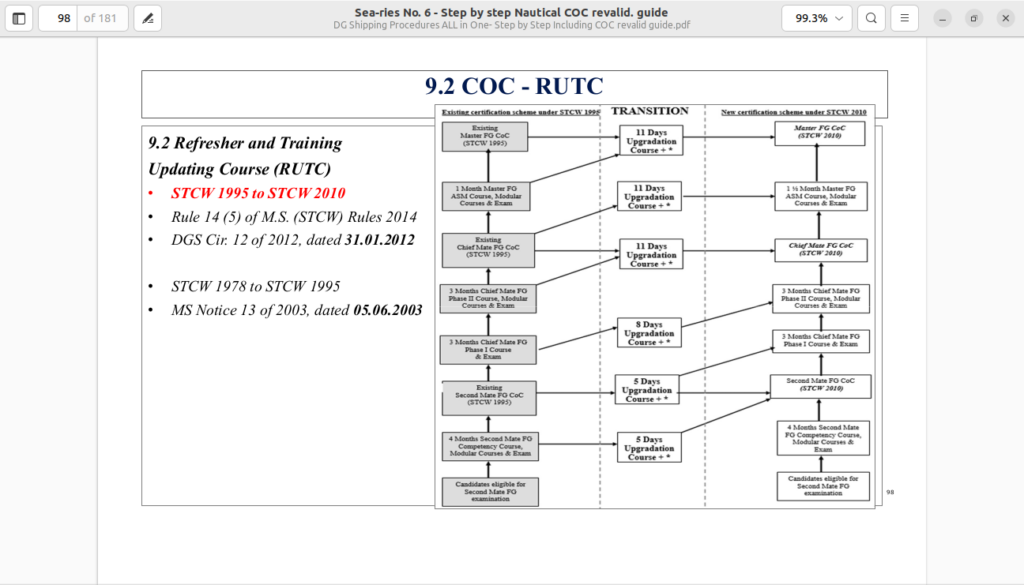 You must complete the Refresher and Updating Training (RUT) courses approved by DG Shipping, which typically include refresher training in personal survival techniques, safety responsibilities, fire prevention and firefighting, and ship security awareness under the STCW 2010 code.