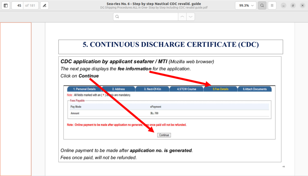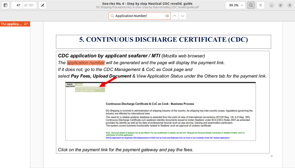 You need to upload your current valid COC, continuous discharge certificate (CDC) pages as proof of sea service, certificates of completed refresher training courses, and medical fitness certificates.