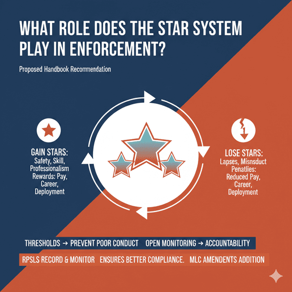 The proposed handbook recommends a star system for the seafarers, wherein stars would be gained by rewarding and acknowledging safety, skill, and professionalism, and reduced for lapses that result in loss or reduced pay, career development, and deployment. Established thresholds ensure the prevention of poor conduct; open monitoring ensures accountability, a significant element in addition to the Maritime Labour Convention Amendments. RPSLs monitor and record the same for deployments, thus ensuring better compliance.