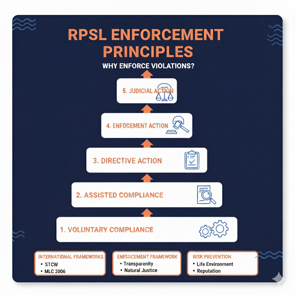RPSLs enforce breaches in an attempt to promote voluntary compliance, protect maritime security, and implement conformity with international frameworks such as STCW, SOLAS, and MLC 2006 in conformity with the guidelines under the Merchant Shipping Act. The framework for enforcing breaches focuses on transparency, proportionality, and natural justice, allowing RPSLs to handle minor issues in-house with their Safety Management Systems (SMS) before referring them to DGS. This also helps RPSLs prevent deliberate non-compliance that may threaten life, environment, and reputation in line with the key principles illustrated in the manual guidelines for RPSLs listed within the INDOSearch RPSL directory.