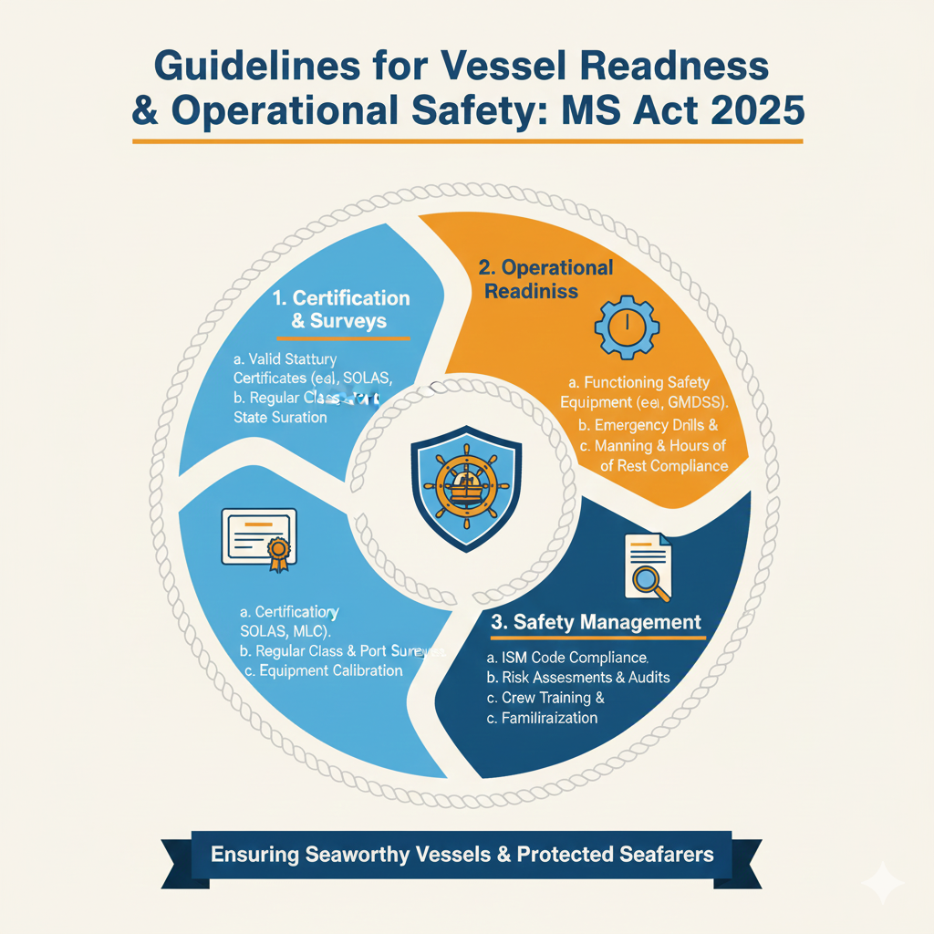 Merchant shipping act, 2025 lays down the legal foundation for safety and security at sea, covering vessels, ports, and the companies that operate them. This is to bring Indian maritime operations to alignment with international safety conventions while clearly defining the duties of ship owners, masters, and authorities. From vessel certification and seaworthiness to emergency response, passenger safety, and incident reporting, this part ensures that life, property, and the marine environment are protected at every stage of a voyage.