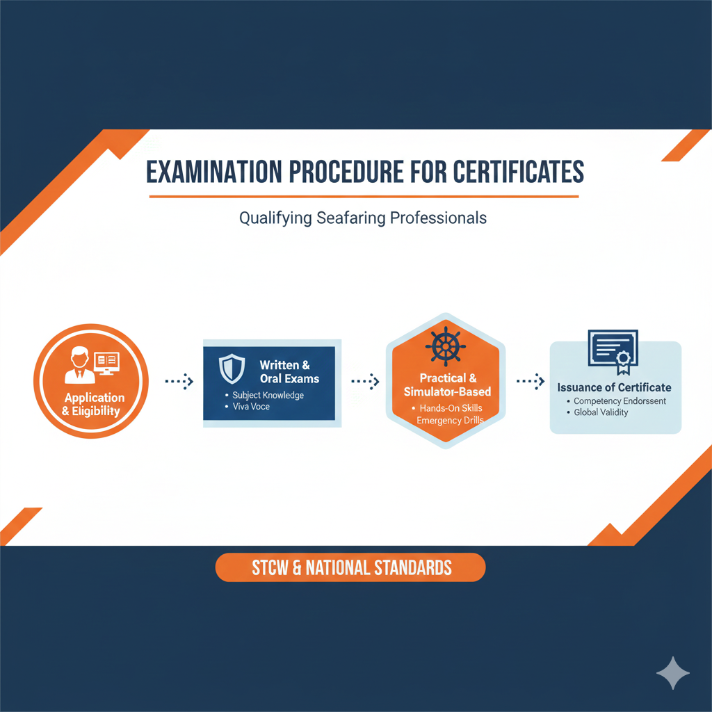 To acquire the certifications needed (COCs and COPs) seafarers will have to go through different levels of examinations. Under the STCW convention, the central government is advised to select and appoint 2 chief examiners to invigilate the exams conducted, the two chief examiners are as follows: